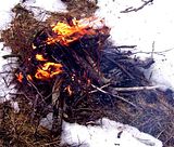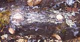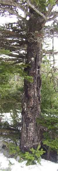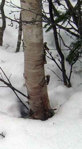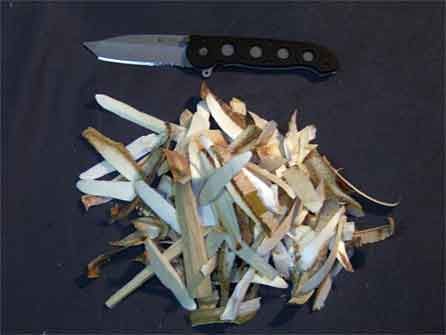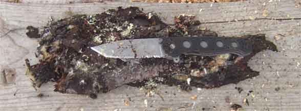 Removing bark to gather the heavy pitch, the M16 worked well cutting around the sap on thick barks, using a hammer grip cutting with the point. The serrations work well making the vertical cuts at the end as they cut through the bark more effectively than the plain edge. It is more efficient to cut well away from the sap both to not waste any and to try to keep it away from knife as much as possible. The M16's point is then worked under the cuts in the bark, to pry it up, a bark spud can be carved here to make this process a little easier. The bark can be processed to make glue, the easiest way to get it off the bark is to boil it and remove the sap as it seperates. To the sap add animal scat, ash, wax or tallow to make pitch glue. The glue can be used as a water sealant as well, and it burns very well so makes excellent torches and tinder. |