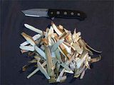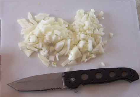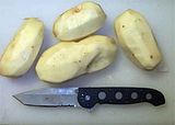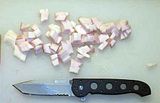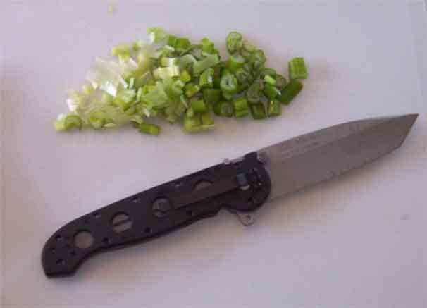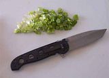 As a utility knife, it worked well for tasks which were more centered on pure sharpness such as slicing up green onions. It could also slice up onions readily, including the horizontal cuts necessary for fine dicing, but had control issues due to the greater cross section compared to optomized kitchen utility knife, but in general did well for a tactical type folder. On slicing thicker and more rigid vegetables such as potatos, it started to lag behind and a more optimal knife would quickly be desired and for a lot of fine dicing a dropped blade would make working to a cutting board much easier. |