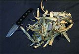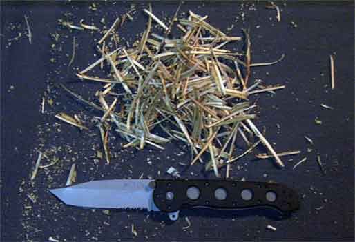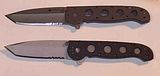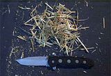 Carving wood, the M16 make 100 slices into a piece of clear pine lumber. The edge sank in readily due to the acute profile and the grip was decently comfortable. However clear pine is very soft and easy to cut. The same amount of work was done on a piece of birch (tree branch). The inside of the handle slabs on the M16 were found to be a little sharp, but above average. The cutting is best done with the plain edge but this is so far infront of the grip that there is a large leverage disadvantage. This can be compensated for by running the index finger in the choil, but this generates discomfort against the pinky which is no longer in the curved section of the grip and now isn't as well supported. More cutting was performed on 3/8" plywood. The M16 cut well and had no trouble cutting the hard wood including sectioning through a couple of knots. There was no visible damage to the edge, which also showed no chipping under 10 times magnification This wood working did blunt the edge down past the ability to slice paper, so it was resharpened, still having the origional hollow ground edge profile. |