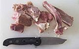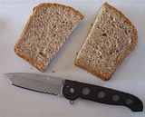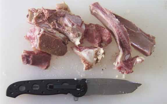 For working on meats, the M16 readily sliced through some strips of pork which just demands a high sharpness. It also worked well seperating some pork ribs easily slicing through the connective tissue and through the end caps of the bone. For thicker cuts of meat a long blade would be prefered and the tanto point is less than optimal as a smooth curve is easier to use. The tanto on the M16 however isn't as abrupt as those found on knives like the WB and thus is inbetwen that geometry and a drop/clip point in the flow of the belly. The serrations do lower performance on long slices as well but can come in handy making hard cuts such as slicing the heads off of large cod. |